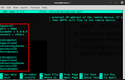 2.Selanjutnya kita konfigurasi file sip.conf, disini kita akan menambahkan 2 nomor telpon.